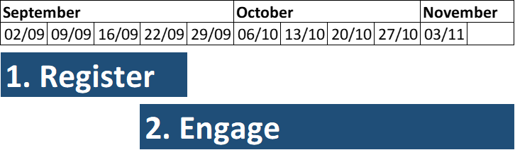 Create a simple plan covering when and how you communicate with the people you want in your team to ensure they understand what they need to do and register. You may want to communicate more broadly through social media.